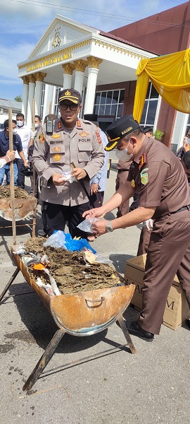 LANGSA (Waspada): Kejaksaan Negeri Kota Langsa, Rabu (23/11) memusnahkan barang bukti dari 123 kasus kejahatan, terdiri dari kasus sabu-sabu 80 perkara, ganja dengan jumlah 12 perkara dan tindak pidana umum lainnya 31 perkara yang telah dinyatakan berkekuatan hukum tetap selama Desember 2021 s/d November 2022.