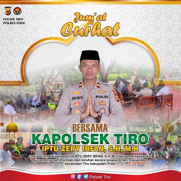 Kapolsek Tiro, Iptu Zery Ifan menjelaskan Program ‘Jumat Curhat’ yang digagas Mabes Polri ini supaya Kepolisian menerima curhatan masyarakat terkait tugas anggota di lapangan termasuk memberi saran dan masukan atas hal yang dirasakan masyarakat.