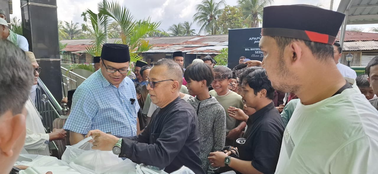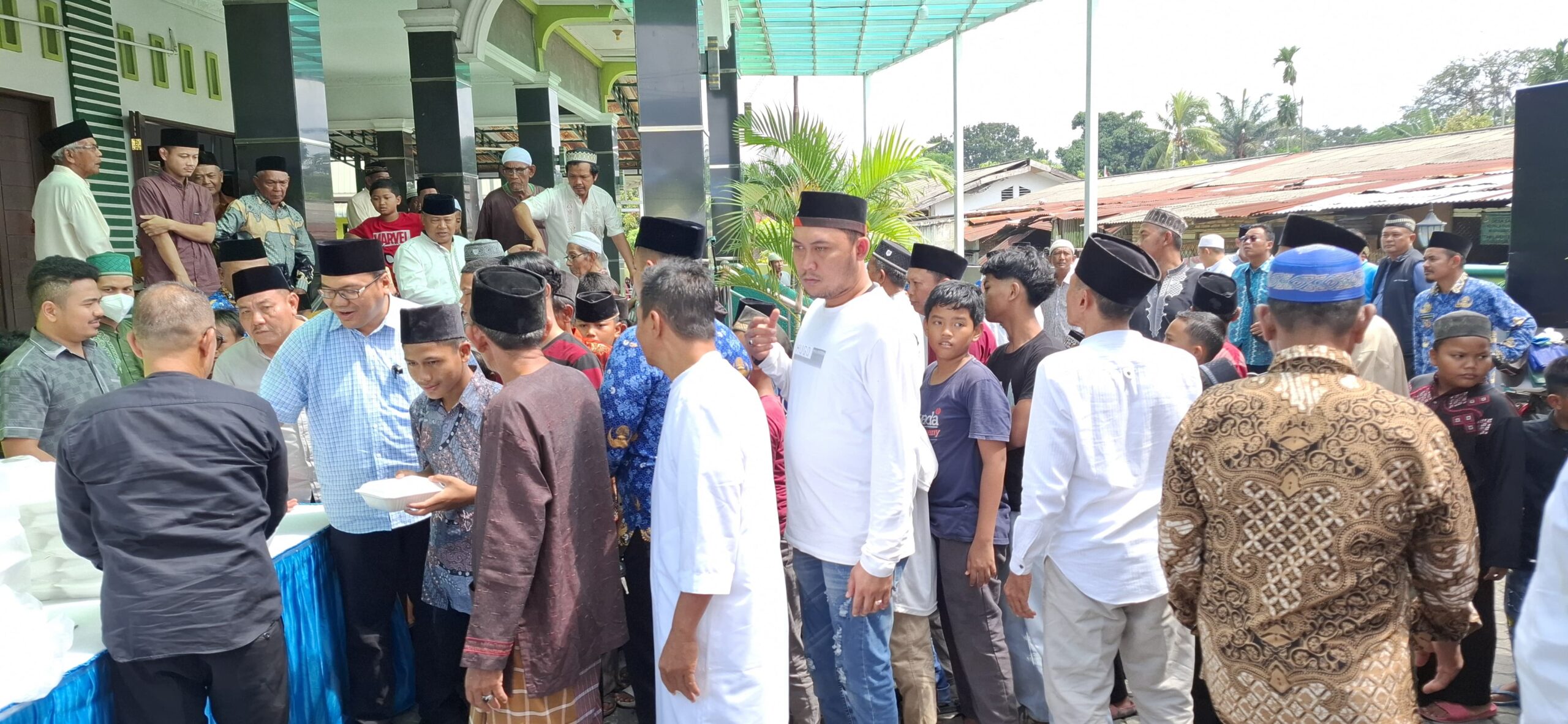 DELISERDANG (Waspada): Bupati Deliserdang terpilih, dr. H.Asri Ludin Tambunan membagikan ratusan kotak nasi kepada jemaah Masjid Nurul Qomar di Dusun 6, Desa Saentis, Kecamatan Percut Seituan, Jumat (17/1/25).