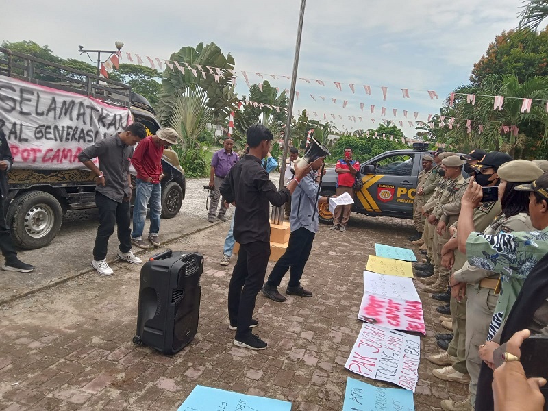 BATUBARA (Waspada): Massa Aliansi Pemuda Mahasiswa Kecamatan Seibalai, Kabupaten Batubara melakukan aksi unjuk rasa (Unras) ke Kantor Camat Seibalai, Kamis (22/8).