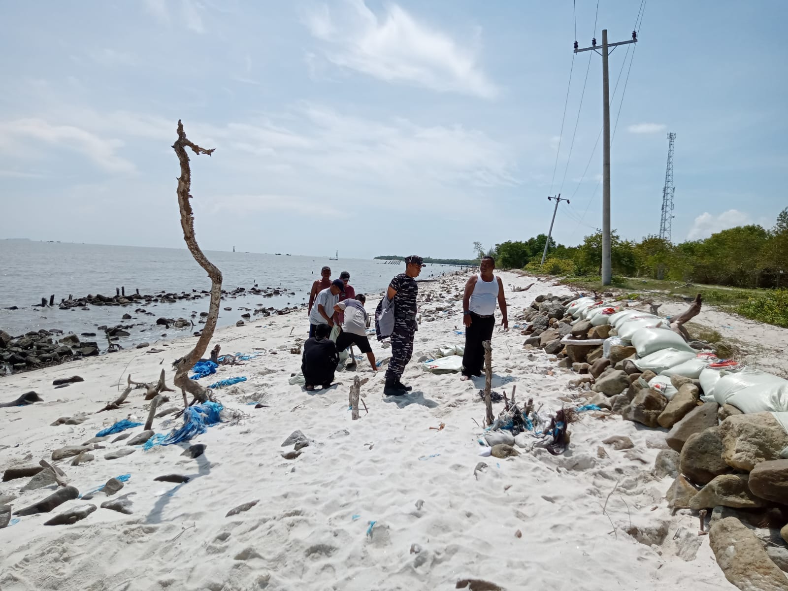 dengan goni berisi tanah/pasir di sisi pantai sekaligus menutup kerusakan ruas jalan yang mengalami rusak berat/ amblas akibat dikikis erosi agar sarana penghubung satu-satunya menuju desa nelayan ini dapat dilalui warga maupun nelayan menjalani aktivitas sehari-hari.