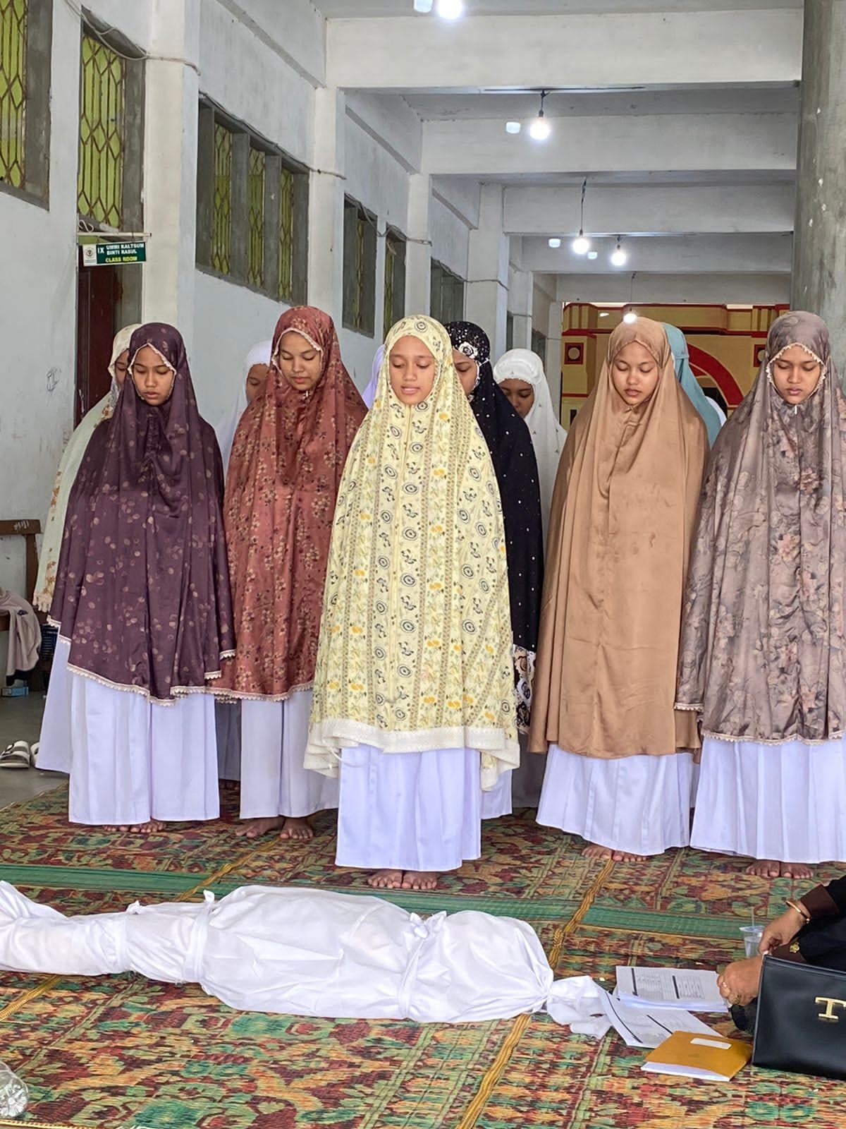Sedangkan Tgk Nasruddin, S.Pd.I pemateri praktik memandikan mayat untuk santri putra. Tgk Akmal pemateri praktik mengkafani jenazah untuk santri putra dan Ust. Hafiz Nasution Lc. Pemateri praktik shalat jenazah untuk santri putra.