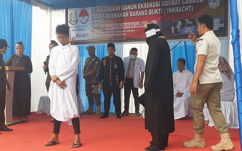 Tujuh terpidana yang dicambuk algojo tersebut harus menerima cambuk sebanyak 7 sampai 8, 18 dan seratus kali cambukan, terutama yang terjerat kasus Khalwat dan kasus Maisir yang tertangkap Satpol PP dan Wilayatul Hisbah.