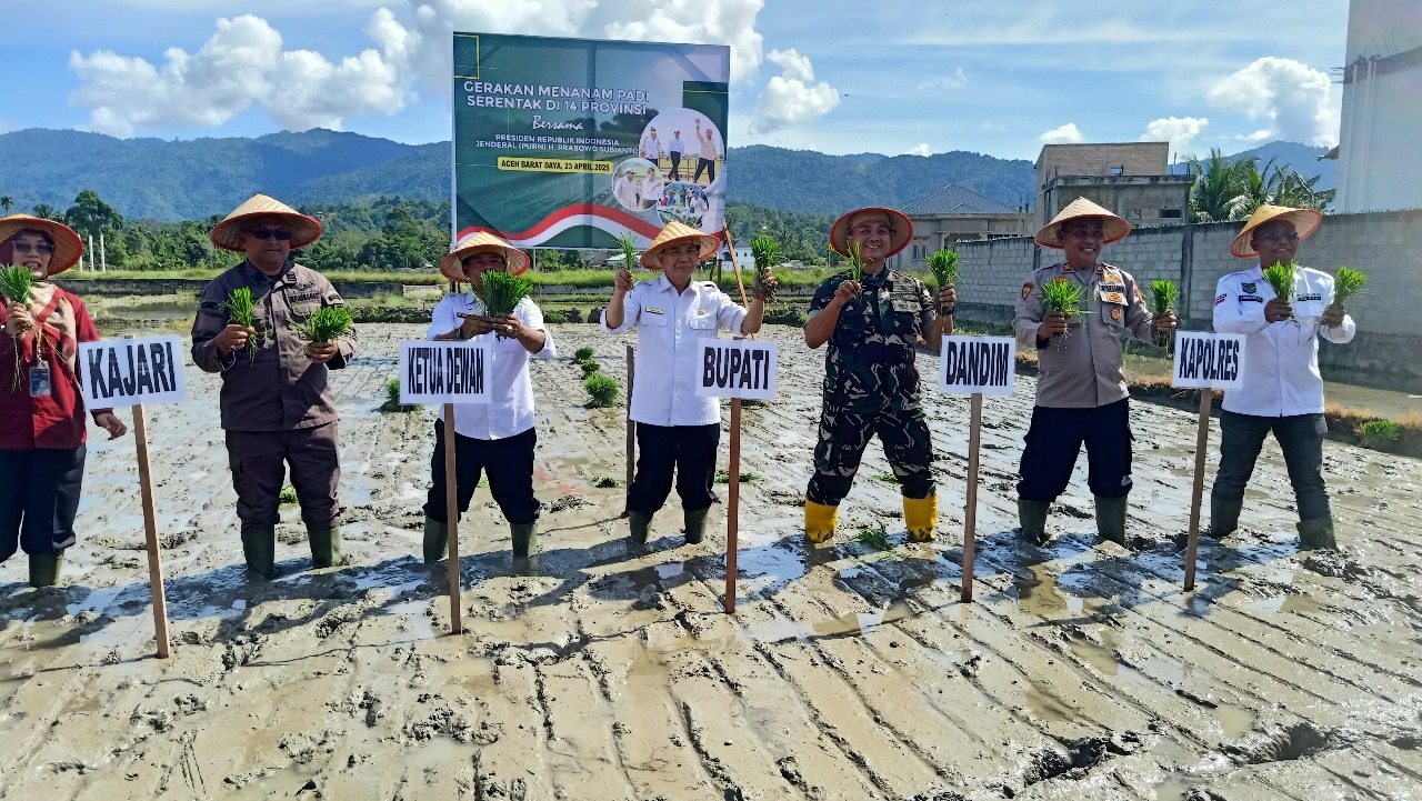 Kegiatan tanam serentak daring bersama Presiden Prabowo Subianto di 14 Provinsi hari itu, diikuti Sekda Abdya Rahwadi mewakili Bupati Abdya Safaruddin. Didampingi Dandim 0110/Abdya Letkol Inf Beni Maradona, Kepala Perum Bulog Cabang Blangpidie Nurul Iranda Sari, mewakili unsur Forkompinda lainnya, serta para penyuluh pertanian dan anggota kelompok tani setempat. “Alhamdulillah, dengan awal yang baik ini, semoga tanaman padi petani bisa meningkat dalam MT Gadu tahun ini,” harap Sekda Rahwadi.