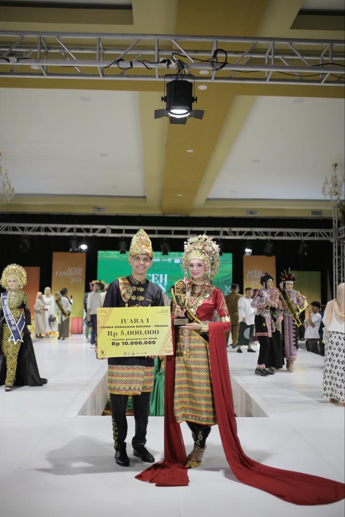 Pasangan model pada Aceh Fashion Festival 2023 Runway Busana Tradisi yaitu Ulya Munawarah dan Ghufran menampilkan Runway selama tiga menit dengan presentasi satu menit. (b05)