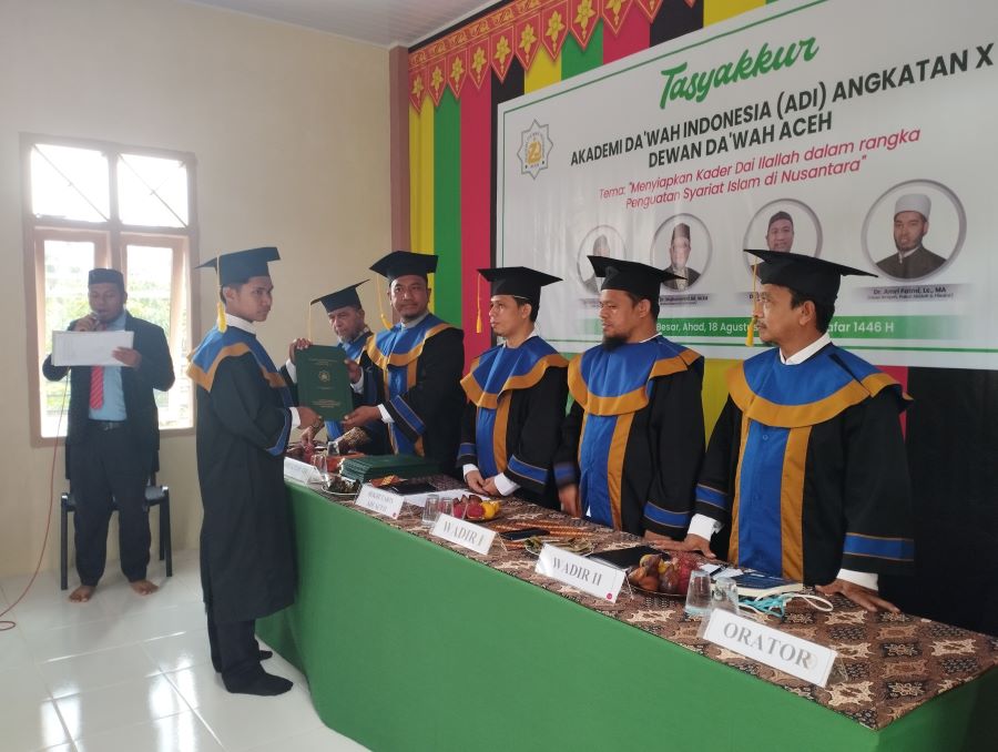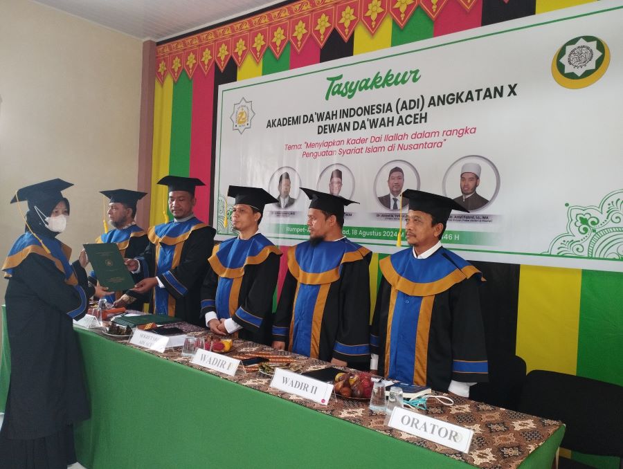 ACEH BESAR (Waspada): Akademi Dakwah Indonesia (ADI) Aceh yang merupakan lembaga pendidikan dibawah Dewan Da’wah Islamiyah Indonesia menggelar acara wisuda/tasyakuran angkatan X tahun akademik 2023/2024 di kampus ADI Komplek Markaz Dewan Dakwah Aceh (DDA), Gampong Rumpet, Kecamatan Krueng Barona Jaya, Aceh Besar, Minggu (18/8/2024).