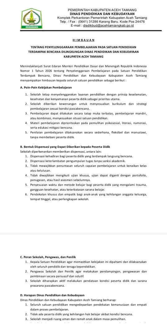 Terkait hal ini, Dinas Pendidikan Dan Kebudayaan Kabupaten Aceh Tamiang juga menindaklanjuti Surat Edaran Menteri Pendidikan Dasar dan Menengah Republik Indonesia Nomor 1 Tahun 2026 tentang Penyelenggaraan Pembelajaran pada Satuan Pendidikan Terdampak Bencana, dan mengeluarkan surat imbauan kepada seluruh satuan pendidikan antara lain point – pointnya yaitu berkaitan dengan Kebijakan Pembelajaran, pertama, sekolah tetap menyelenggarakan layanan pendidikan dengan prinsip keselamatan,kesehatan dan kenyamanan peserta didik sebagai prioritas utama. Kedua, sekolah diberikan kewenangan untuk menyesuaikan kurikulum dan strategipembelajaran sesuai kondisi pascabencana.
