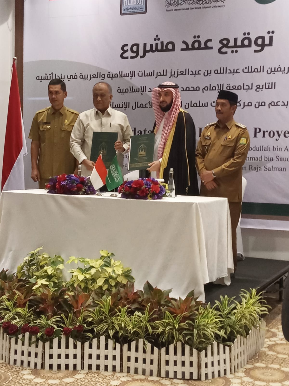 Acara penandatanganan dihadiri oleh perwakilan Kerajaan Arab Saudi, termasuk Abdulaziz Usman dari Lembaga Bantuan dan Aksi Kemanusiaan Raja Salman, Dr. Walid bin al-Othman selaku Dekan Lembaga Ilmu Pengetahuan Islam dan Arab di Indonesia, Syeikh Saeed bin Khamis al-Ghamidi selaku Direktur Lembaga Pendidikan Bahasa Arab, serta Adel al-Zahrani selaku Ketua Pelaksana Proyek Universitas Islam Imam Muhammad bin Su’ud. Dari pihak Aceh, hadir Sekretaris Daerah Aceh Muhammad Nasir, Wakil Bupati Aceh Besar Syukri, perwakilan Kakanwil Kemenag Aceh, Kadis Syariat Islam Aceh, dan tokoh masyarakat lainnya.