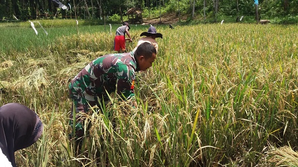 Sertu Suhariadi dalam menyemangati para petani juga turut membantu memanen padi di lahan milik Syawal luas lahan 0,025 Ha yang merupakan anggota kelompok Tani Jaya Tani Desa Purwodadi, Kecamatan Kejuruan Muda pada Kamis (4/5).