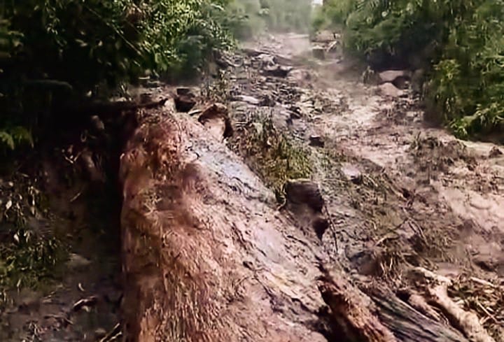 Material kayu, batu, dan lumpur yang menutupi badan jalan membuat tim gabungan belum dapat menjangkau lokasi para pengungsi.