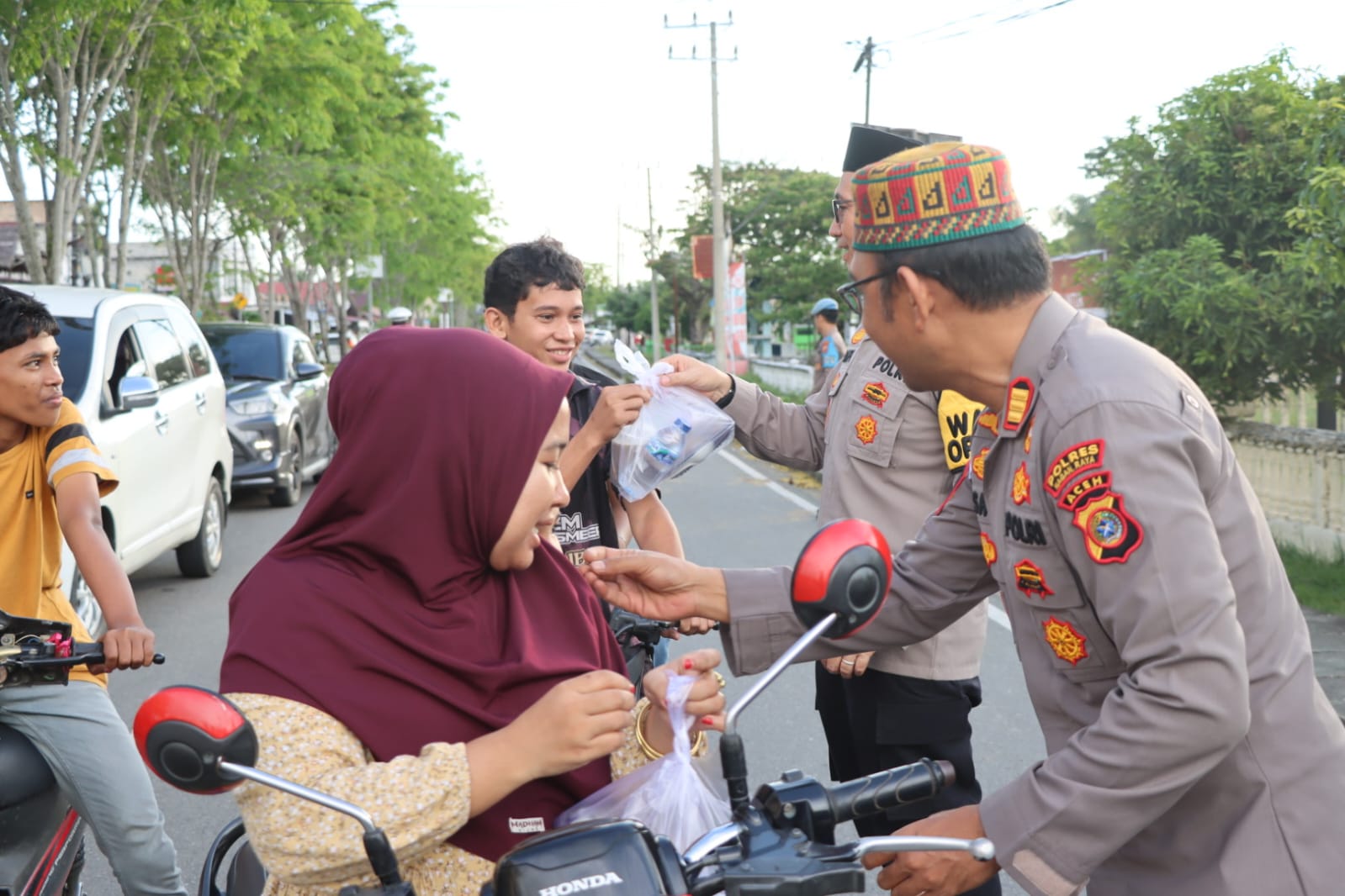 NAGAN RAYA (Waspada.id): Polsek Kuala, Polres Nagan Raya, Polda Aceh membagikan takjil kepada para pengguna jalan di depan Mapolsek Kuala, Desa Ujong Fatihah, Kecamatan Kuala, Kabupaten Nagan Raya. Rabu (18/3).