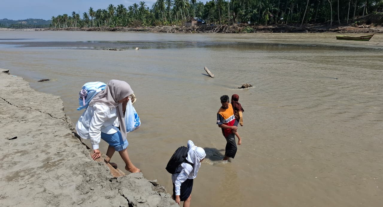 BIREUEN (Waspada.id): Tangannya erat menggenggam tangan anaknya, Fitri berjalan pelan menyusuri aliran air Krueng Peusangan yang menggenangi betisnya.