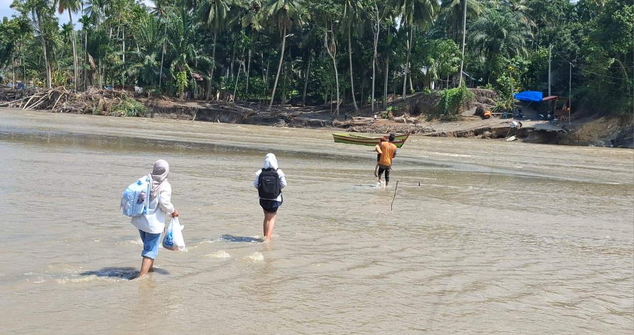 Jalan alternatif yang ada jauh sekali, harus melewati bekas lokasi banjir di pinggiran sungai arah selatan dan melintasi bukit dengan jalur yang sangat sulit dilewati. “Untuk kami perempuan tidak bisa,” tambahnya dengan nada khawatir.
