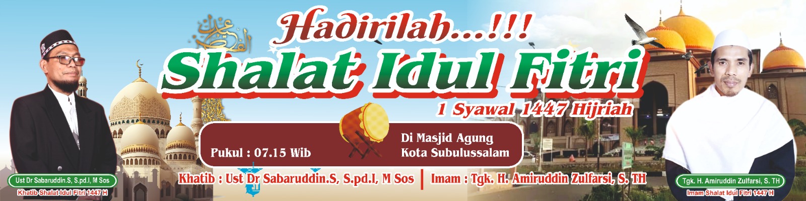 SUBULUSSALAM (Waspada.id): Ustadz Dr. Sabaruddin S, S.PdI, M.Sos dijadwalkan sebagai khatib dan Tgk. H. Amiruddin Zulfarsi, S.Th sebagai imam Shalat Hari Raya Idul Fitri, 1 Syawal 1447 Hijriah di Masjid Agung Subulussalam, Sabtu (21/3) besok.