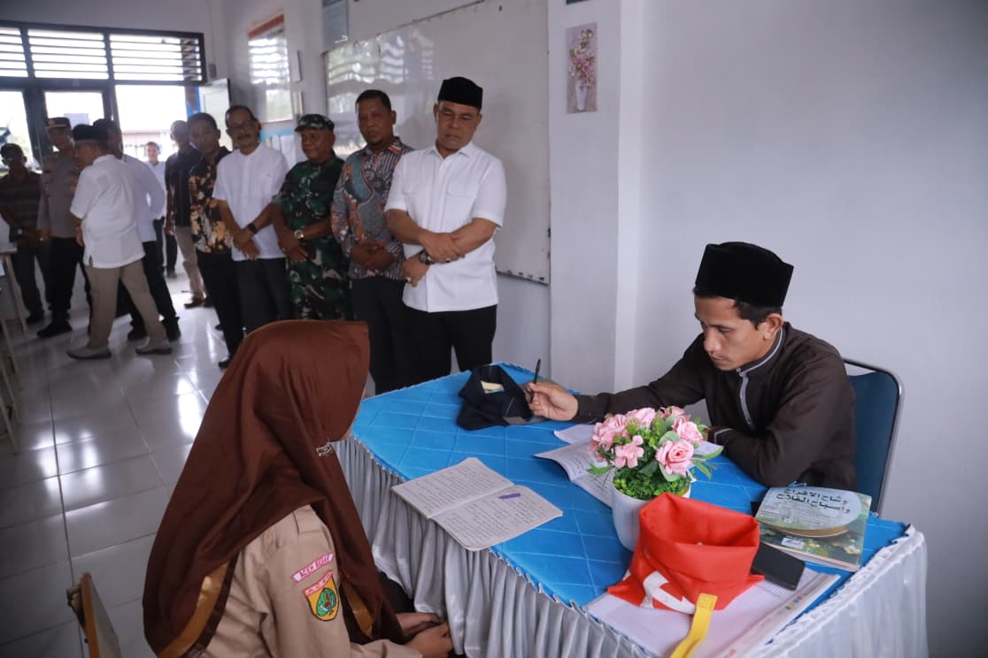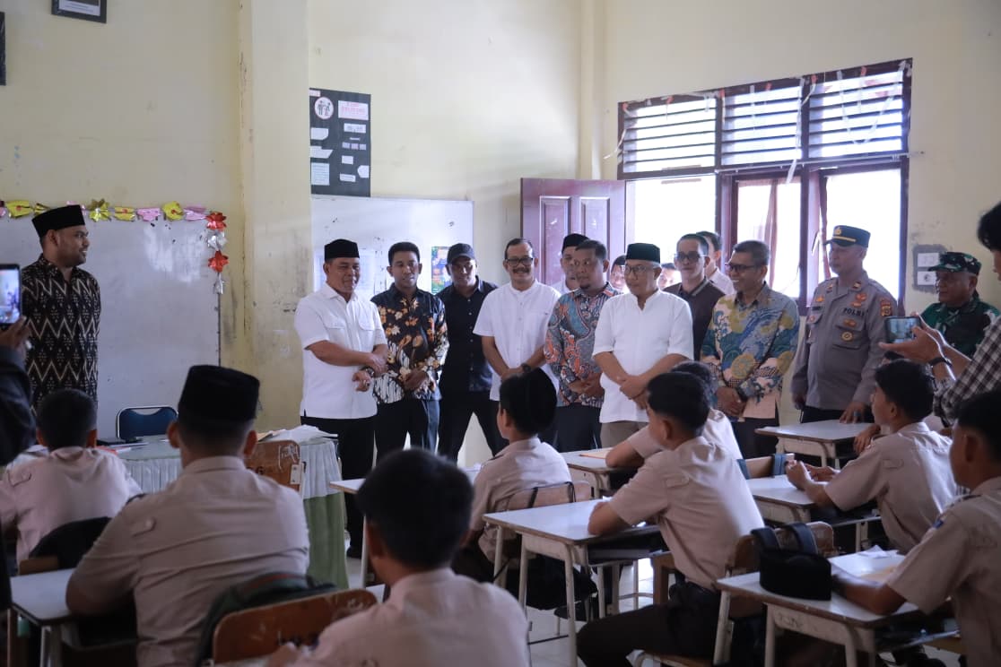 KOTA JANTHO (Waspada.id): Bupati Aceh Besar H Muharram Idris didampingi Asisten 1 Farhan AP, Plt Kadisdikbud Aceh Besar Dr Agus Jumaidi SPd MPd, Kadisdik Dayah Aceh Besar Abu Bakar SAg, Camat Peukan Bada Salamuddin SE, dan Muspika Peukan Bada meninjau pelaksanaan ujian Beut Kitab Bak Sikula di SMPN 1 Peukan Bada, Jumat (5/12).
