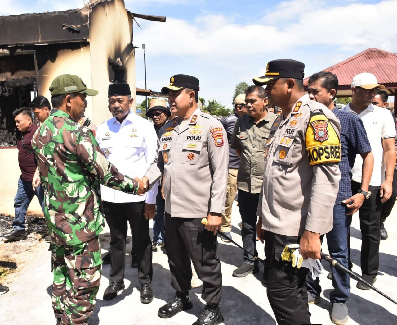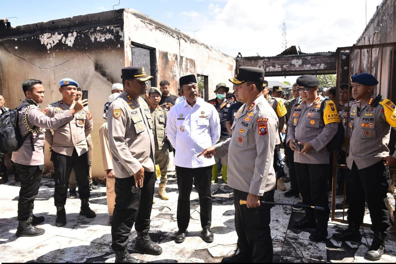 MUARA BATANG GADIS (Waspada.id): Bupati Mandailing Natal (Madina) H. Saipullah Nasution mendampingi Kepala Kepolisian Daerah Sumatera Utara (Kapolda Sumut) Irjen Pol. Whisnu Hermawan Februanto mengecek Mapolsek Muara Batang Gadis (MBG) yang dibakar massa akhir pekan lalu.
