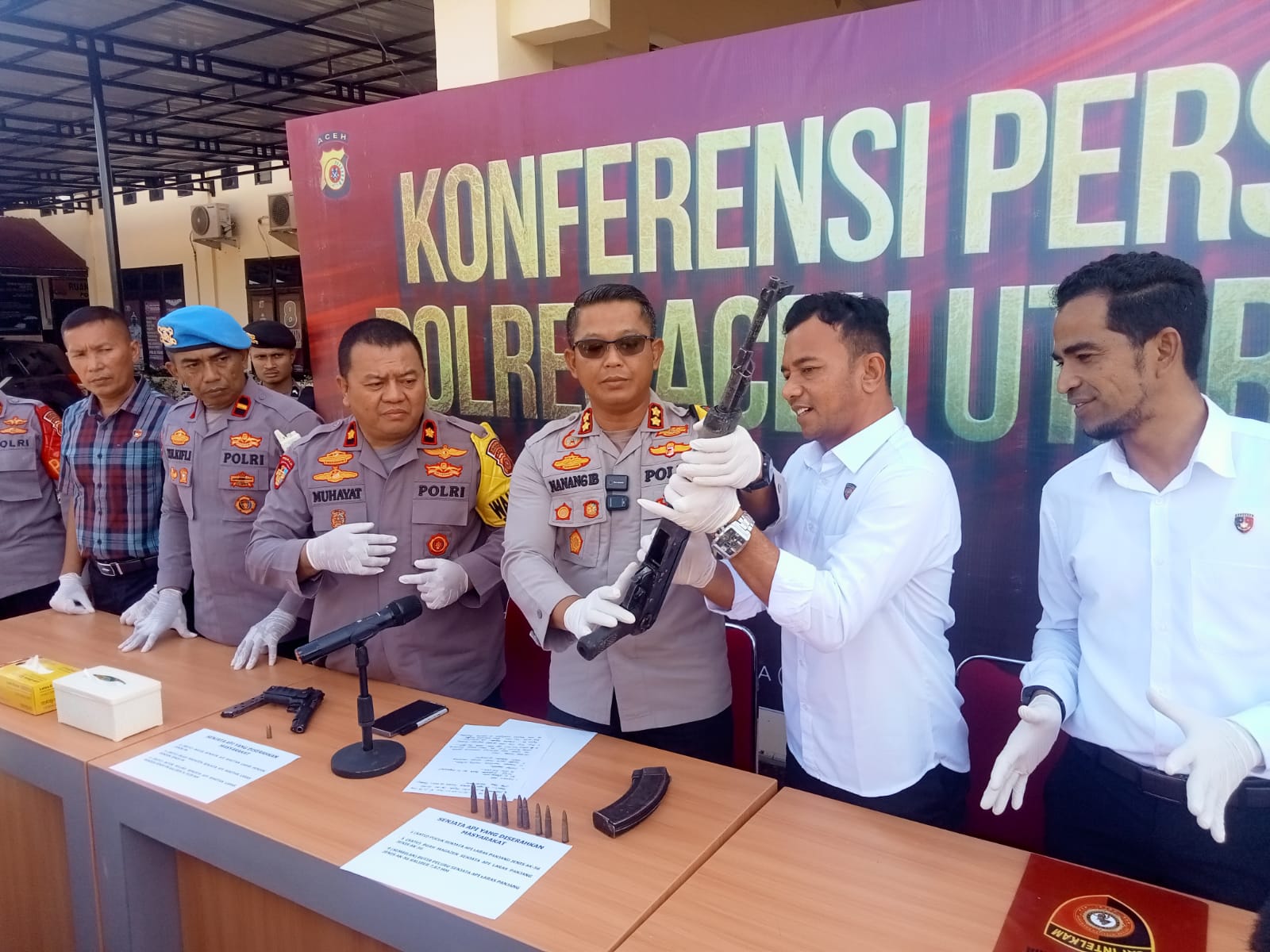 Senjata api yang dulu pernah digunakan di masa konflik senjata api di Aceh dulu itu diperlihatkan dalam konferensi pers di halaman depan Mapolres Aceh Utara.