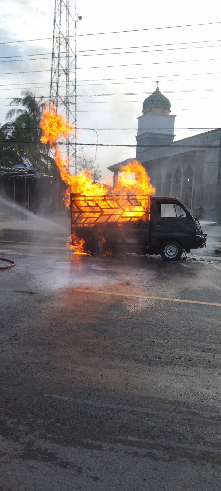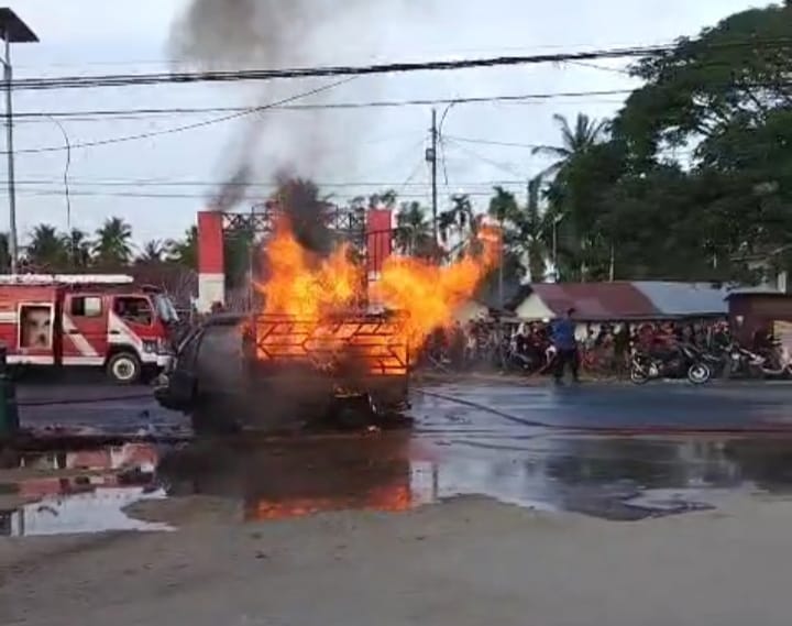 LANGSA (Waspada.id): Diduga mengangkut Bahan Bakar Minyak (BBM), satu unit mobil pick mengangkut 24 jerigen terbakar hebat di Jalan Medan-Banda Aceh tepatnya depan Masjid Sabilussalam Gampong Sungai Lueng, Kecamatan Langsa Timur, Kota Langsa Jumat (06/02/2026) sore.