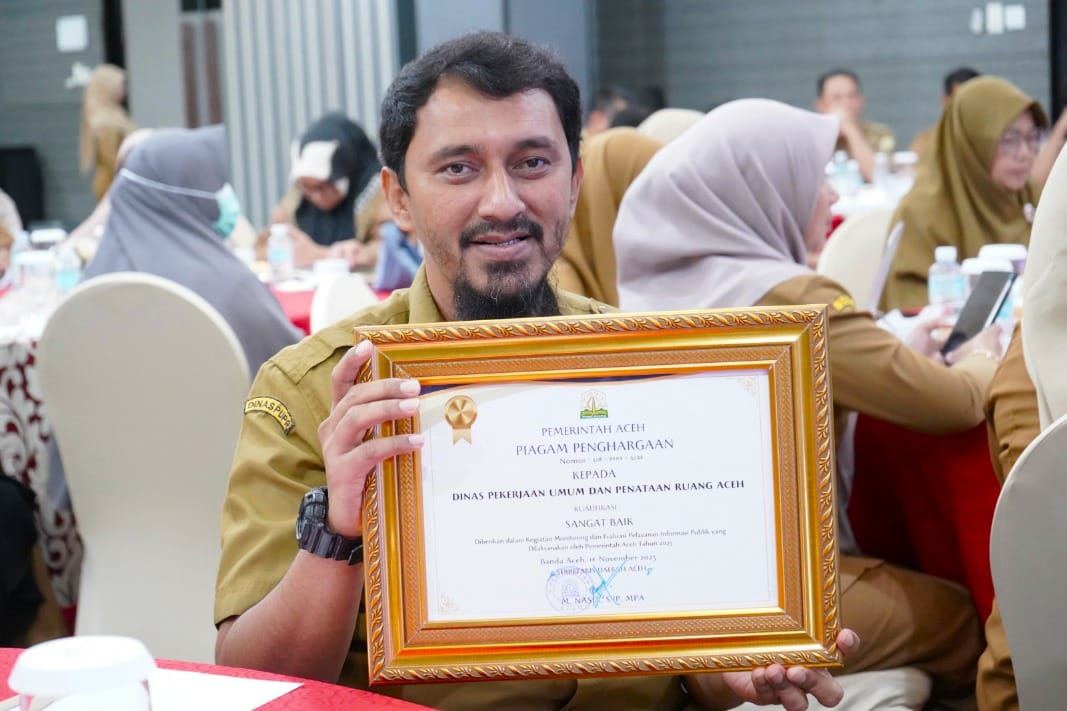 Penghargaan ini diserahkan langsung oleh Kepala Dinas Komunikasi, Informatika dan Persandian (Diskominsa) Aceh, Dr. Edi Yandra, S.STP, MSP, kepada Sekretaris Dinas PUPR Aceh, A. Ricky Soehady, ST, MT, di Kyriad Muraya Hotel Banda Aceh, Senin (24/11).