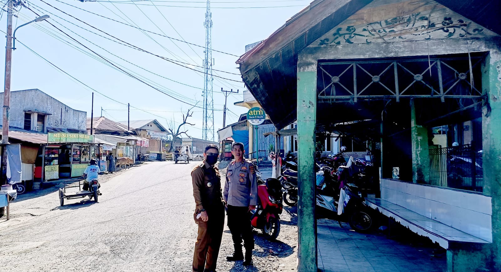 Teks Photo: Camat Kembang Tanjong, Kabupaten Pidie Fauzi Harva, didampingi Kapolsek Ipda Effendi berdiri dekat Halte di Jalan Glumpang Payong- Sigli, tepatnya di pusat pasar, Kecamatan Kembang Tanjong, Senin (29/5) Waspada/Muhammad Riza