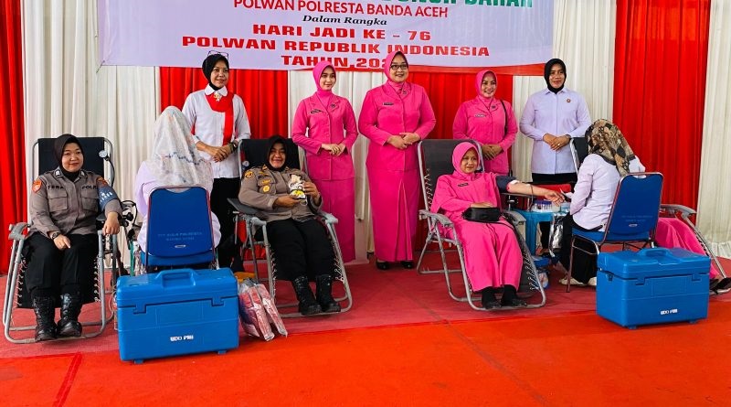 BANDA ACEH (Waspada): Dalam rangka menyambut HUT Ke-76 Polwan tahun 2024, Polwan Polresta Banda Aceh bersama Bhayangkari Cabang Kota Banda Aceh melaksanakan bakti sosial berupa donor darah yang dilaksanakan di Indoor setempat, Selasa (20/8).