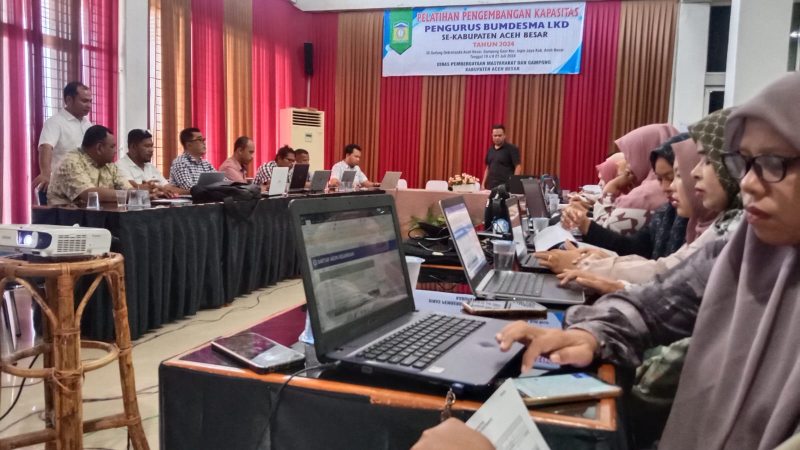 KOTA JANTHO (Waspada): Dinas Pemberdayaan Masyarakat dan Gampong (DPMG) Aceh Besar melaksanakan Pelatihan Penyusunan Laporan Keuangan Syariah bagi pengurus Badan Usaha Milik Desa Bersama Lembaga Keuangan Desa (BUMDesMa LKD) Se – Aceh Besar, di Dekranasda Aceh Besar, Gampong Gani, Kecakatan Ingin Jaya, Minggu (21/7).