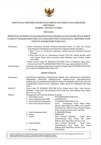 Kepala DPMPTSP Nagan Raya, Diman Dasimun Jum’at (7/7) menjelaskan, SPBU PT Makmur Beutari Jaya saat ini sudah mengantongi izin lingkungan hidup, berdasarkan Keputusan Menteri Lingkungan Hidup dan Kehutanan RI nomor 28102201111150001, tentang persetujuan pernyataan kesanggupan pengelolaan lingkungan hidup usaha PT Makmur Beutari Jaya di Kabupaten Nagan Raya, Provinsi Aceh, oleh PT Makmur Beutari Jaya. Yang ditetapkan di Jakarta pada tanggal 6 Juli 2023, ditandatangani oleh Menteri Lingkungan Hidup dan Kehutanan.