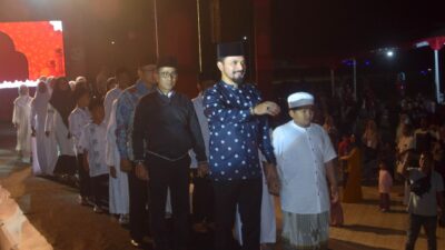 PESERTA FASI: Pengunjung menyaksikan Ketua Komisi I DPR Aceh, Iskandar Usman Al Farlaky (depan), bersama Pj Bupati Aceh Timur, Ir Mahyuddin M.Si, dan pejabat DSI Aceh, memimpin barisan peserta saat membuka FASI Kabupaten Aceh Timur di Idi, Jumat (2/12) malam. Waspada/M Ishak
