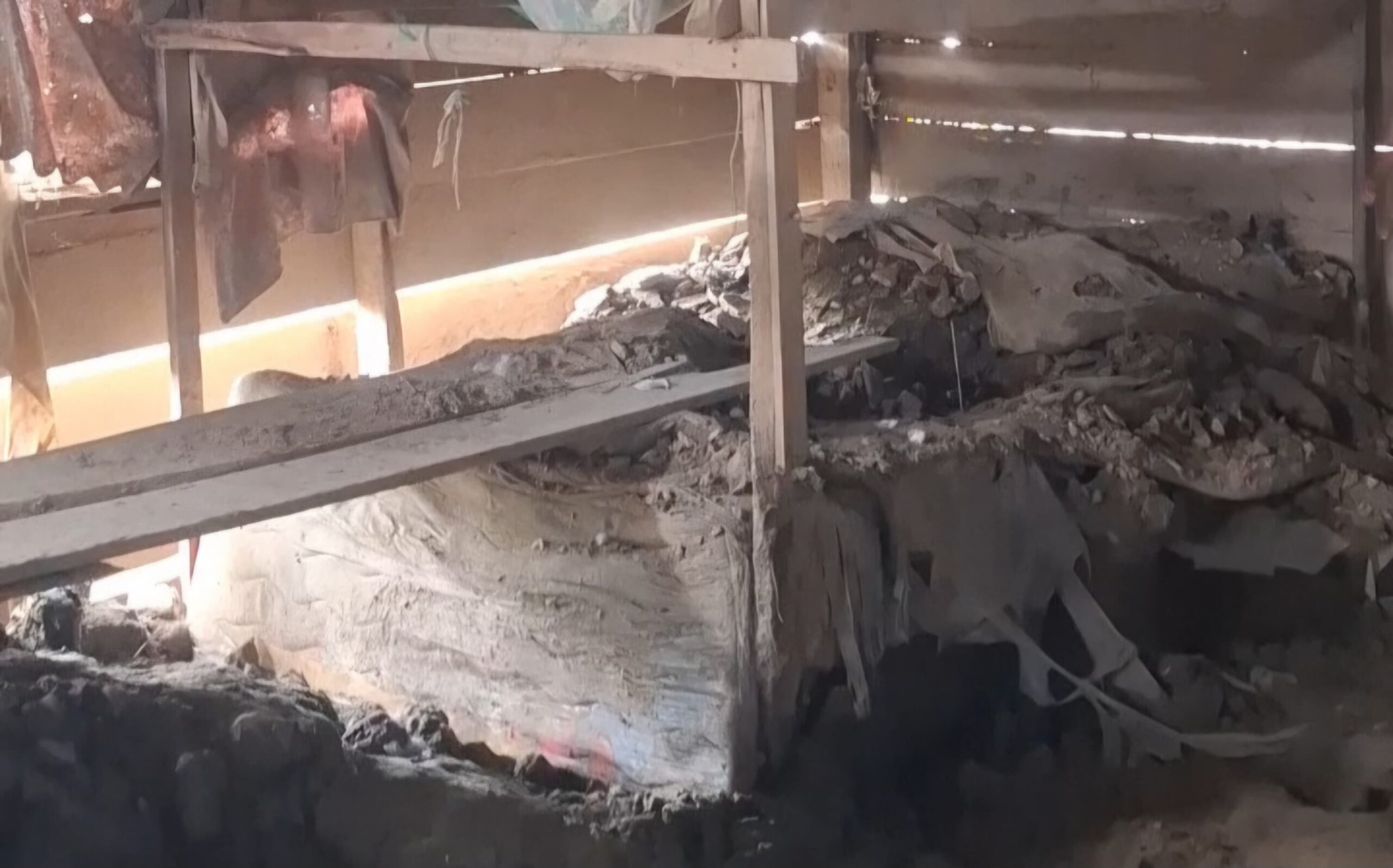Pasir masih memenuhi hampir seluruh bagian rumah. Piring kotor berserakan, pakaian digantung di dinding berlubang. Jamaludin dan dua anaknya—satu duduk di kelas tiga sekolah dasar, satu lagi masih taman kanak-kanak—terpaksa tidur di atas papan yang dipaku seadanya, menggantung sedikit lebih tinggi dari permukaan pasir.