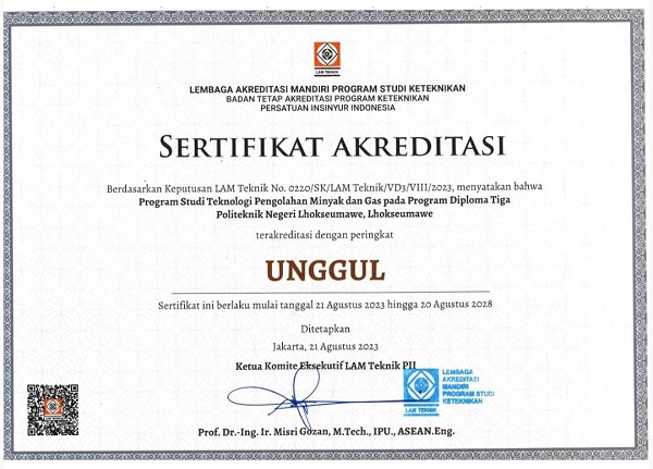Sedangkan Program Studi Teknologi Pengolahan Minyak dan Gas (Prodi TPMG) pada Program Diploma Tiga. Hal ini berdasarkan LAM Teknik No. 0220/SK/LAM Teknik/VST/VIII/2023, ditetapkan di Jakarta mulai berlaku pada 21 Agustus 2023 hingga 20 Agustus 2028.