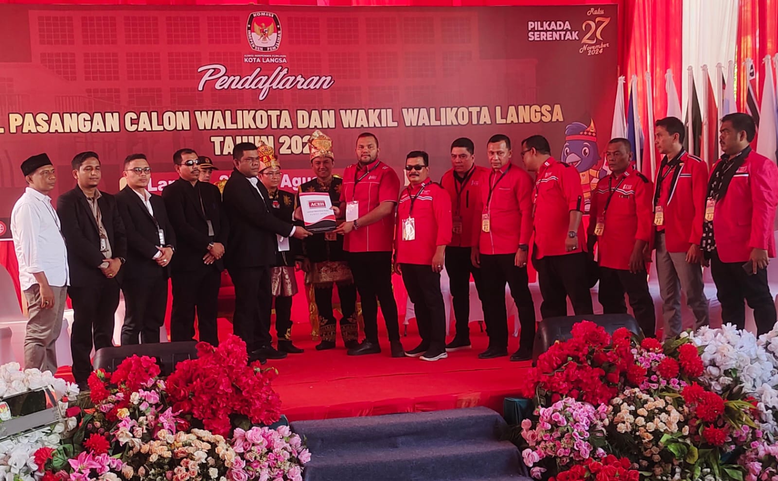 Selanjutnya dilakukan penyematan selempang oleh komisioner KIP Langsa, Komisioner KIP Langsa, Ridwan, ST, Dr (Chand) Bahtiar MA, Muhammad Al-Fadhal, M.Si dan Fauzan Rizal serta dipeusejuk oleh MPU Kota Langsa. Kemudian, Maimul Mahdi, S.Sos. MAP dan Nurzahri, ST menyerahkan dokumen pencalonan diri sebagai Wali Kota/Wakil Wali Kota Langsa pada Pilkada 2024 kepada Ketua KIP Langsa, Ridwan