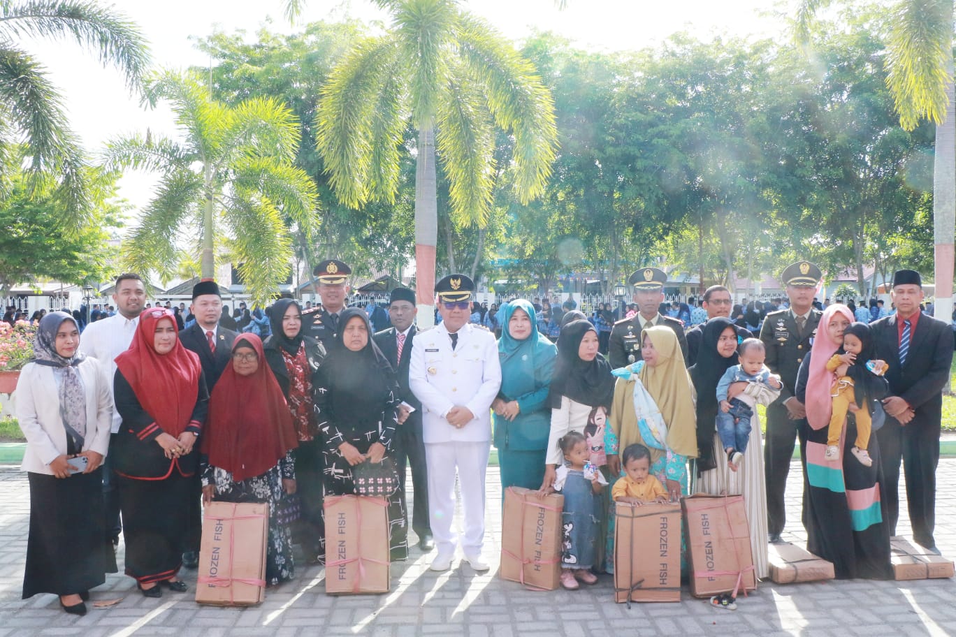ACEH BARAT (Waspada): Peringatan lahirnya Pancasila di Kabupaten Aceh Barat, selaij upacara juga diwarnai dengan pemberian bantuan ikan kepada keluarga kurang mampu dan keluarga balita stunting.