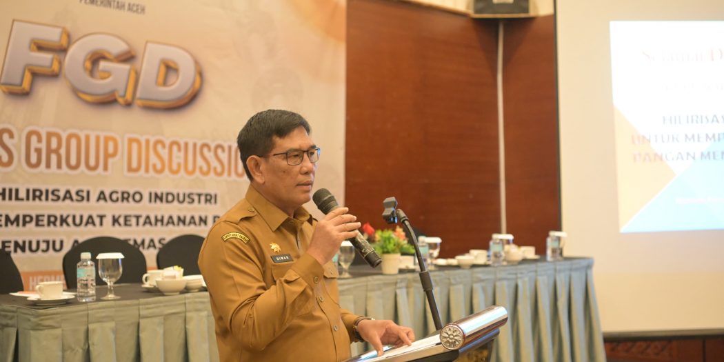 BANDA ACEH (Waspada): Plt Sekda Aceh, Muhammad Diwarsyah, membuka Focus Group Discussion (FGD) bertema “Hilirisasi Agroindustri untuk Memperkuat Ketahanan Pangan Menuju Aceh Emas 2045” di Hermes Palace Hotel, Senin (2/12).
