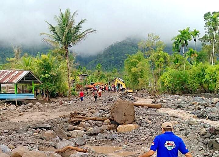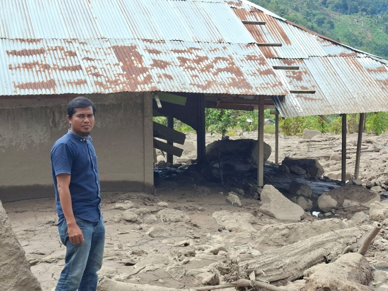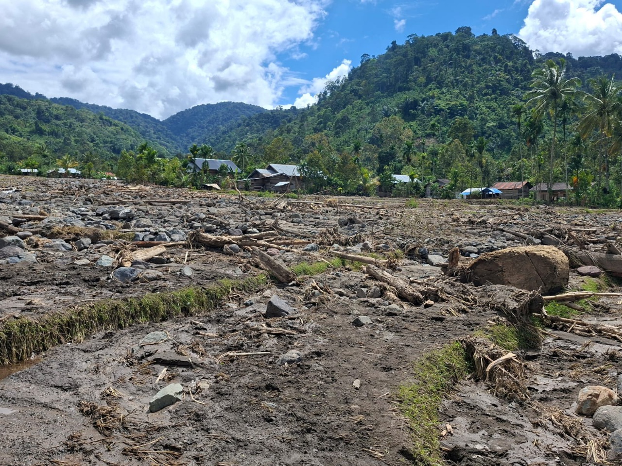 Tidak ada waktu berpikir. Ia menggandeng istrinya, menggendong anaknya, lalu berlari menembus gelap. Beberapa detik setelah mereka menjauh, arus menghantam permukiman. Rumah itu roboh, diseret, lalu hilang seolah tidak pernah ada.