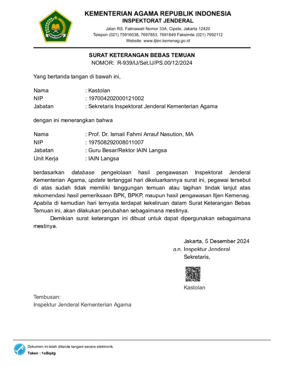 LANGSA (Waspada): Berdasarkan hasil evaluasi dan verifikasi data dari Inspektorat Jenderal Kementerian Agama RI per tanggal 5 Desember 2024, Rektor Institut Agama Islam Negeri (IAIN) Langsa, Prof. Dr. Ismail Fahmi Arrauf Nasution, MA, dinyatakan bebas dari saldo temuan internal maupun eksternal.