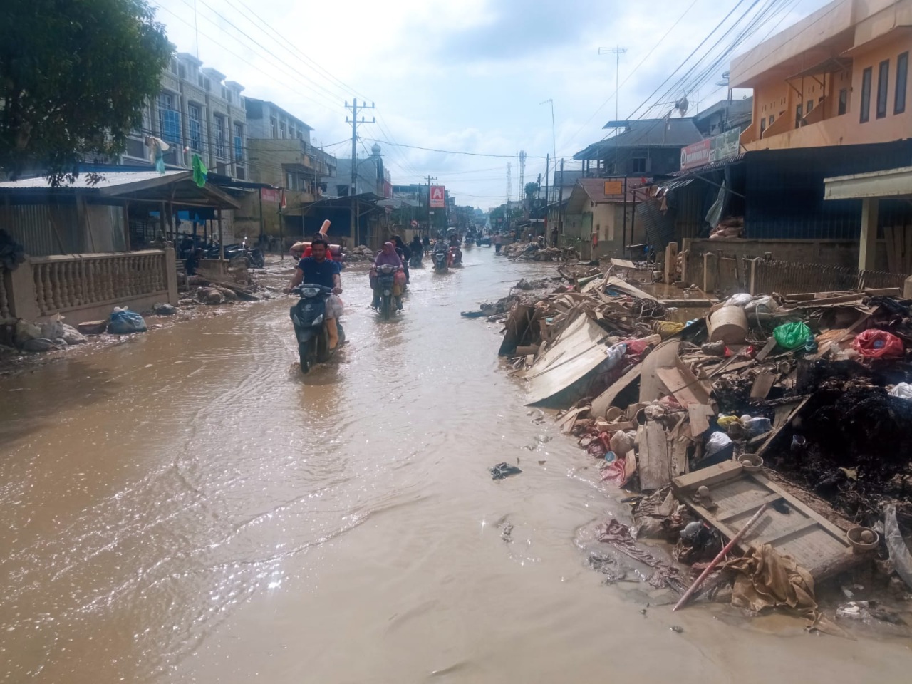 Pantauan Waspada.id, Senin (29/12), badan jalan di Kampung Bukit Tempurung masih digenangi air dan ratusan rumah warga di sana masih digenangi air dan lumpur serta sampah yang merupakan sisa sendimen material pascabanjir Aceh Tamiang yang terjadi November 2025.