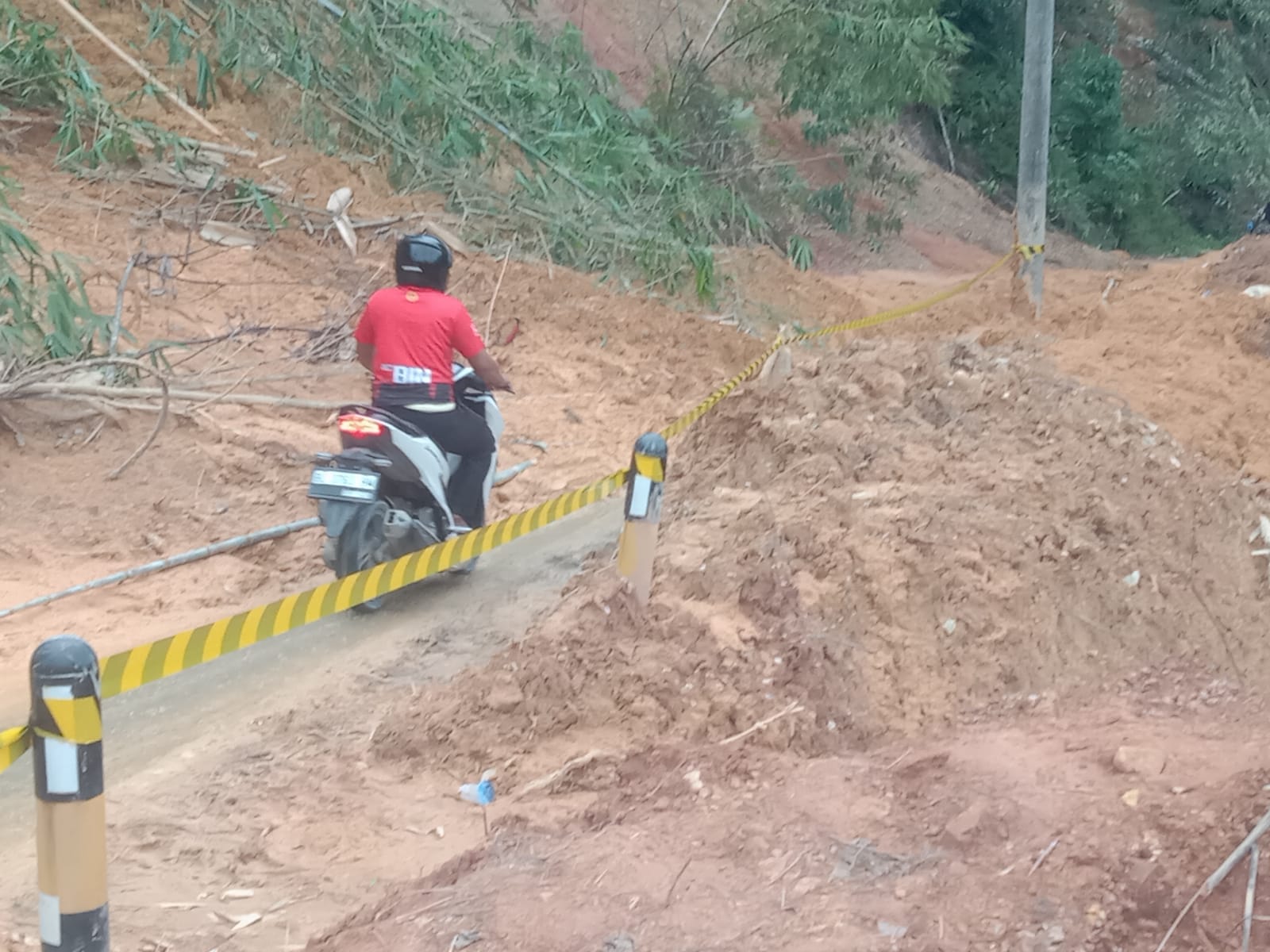 “Sejak dari tadi pagi, kami berusaha membersihkan beberapa meter badan jalan dari timbunan longsor, agar kendaraan roda 2 , roda 3 dan roda 4 bisa lewat. Namun saat kami berusaha menyingkirkan tanah dan kerikil dari badan jalan, tanah longsor kembali terjadi dan menutup jalan ruas Kabupaten tersebut,” sebut Alimin, seraya membersihkan badan jalan dari longsoran tanah agar kendaraan roda 2 bisa lewat.