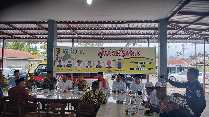 KUTACANE (Waspada): Dalam rangka menjalin hubungan silaturahmi, Kapolres Aceh Tenggara menggelar Jumat Curhat bersama Forkopimda yang dihadiri Camat Bussalam, Supardi S.STP, Kapolsek Babussalam, Iptu Budi Trasilo, para Ustad, Kepala Desa, Tokoh Masyarakat serta tamu undangan di Warkop Ahai 2, Jumat (29/12).