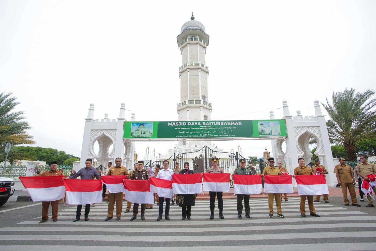 Pembagian sebanyak 500 bendera Merah Putih tersebut berlangsung di depan Masjid Raya Baiturrahman Banda Aceh, Senin, (11/8).