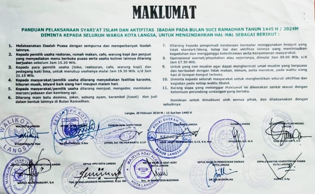 Maklumat panduan pelaksanaan Syariat Islam dan aktivitas ibadah pada bulan suci Ramadan 1445 H/ 2024 M, diminta kepada seluruh warga Kota Langsa untuk mengindahkan hal-hal sebagai berikut: