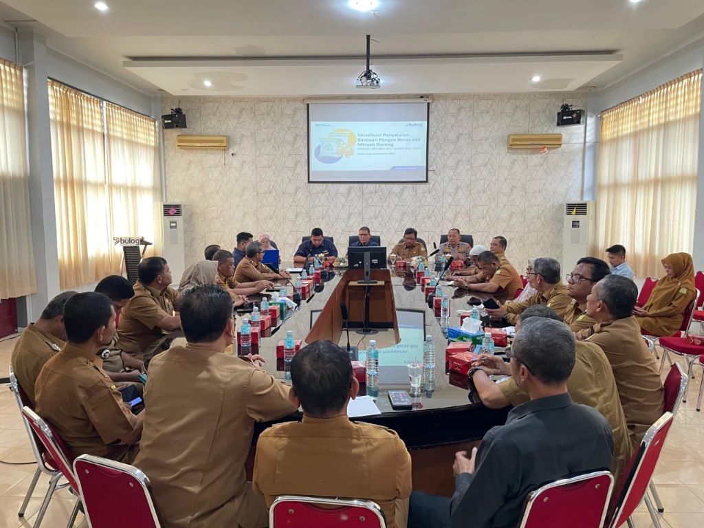BANDA ACEH (Waspada.id): Kepala Dinas Pangan Aceh Besar Alyadi SPi MM, bersama para Camat se-Kabupaten Aceh Besar, mengikuti rapat dan sosialisasi PBP beras dan minyak goreng alokasi Oktober–November 2025 yang digelar Perum Bulog Kanwil Aceh, di Aula Kantor Perum Bulog Aceh, Banda Aceh, Selasa (18/11).