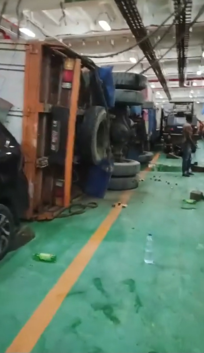 Bahkan saking kerasnya badai tadi malam yang menghantam Kapal Ferry Aceh Hebat 1 sempat menimbulkan kepanikan sejumlah penumpang, satu unit dari sekian truk di atas Kapal AH1, terbalik.
