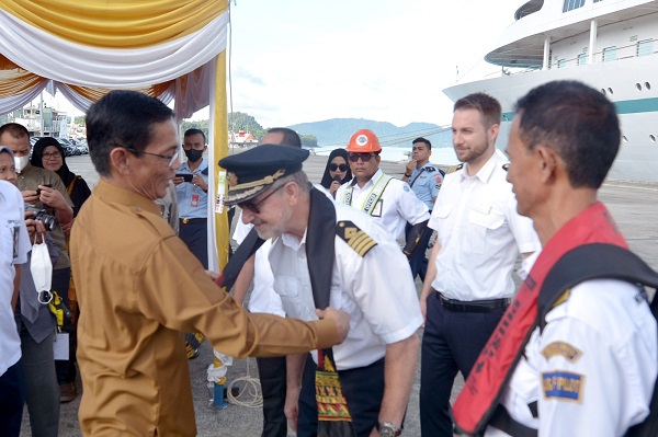 SABANG (WASPADA) : Kapal pesiar MS. Amera singgah di teluk Sabang, Senin (16/01/23) pagi disambut sejumlah pejabat Pemko Sabang dan BPKS.