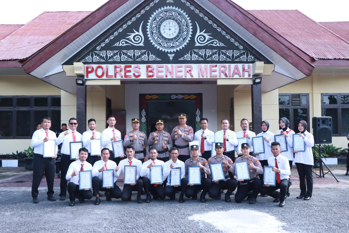 REDELONG (Waspada): Sebagai bentuk apresiasi atas dedikasi dan kinerja luar biasa, Kapolres Bener Meriah AKBP Aris Cai Dwi Susanto memberikan penghargaan kepada sejumlah personel Polres Bener Meriah dalam Apel Penghargaan yang digelar di Lapangan Tribrata, Mapolres setenpat Senin (19/5).