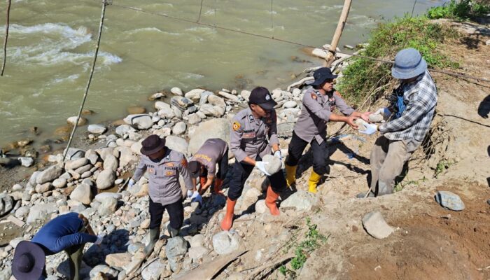 Pembangunan jembatan gantung di Desa Pungke Jaya dipimpin oleh Kaurbinops Satreskrim, Ipda Muhammad Yoga Wiratama, S.Tr.IK., bersama personel Satreskrim dan masyarakat setempat.