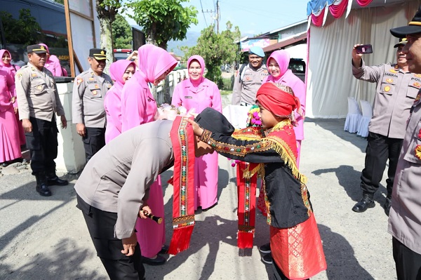 Kedatangan Kapolres bersama Istri kini disambut baik dan menerima pengalungan selempang. Dlam kunker itu Kapolres bersilaturahmi dan bertatap muka serta berdialog langsung dengan Personil Polsek Lawe bulan.