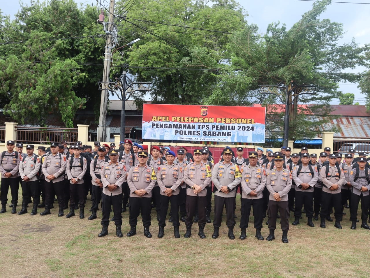 SABANG (Waspada): Kapolres Sabang, AKBP Erwan, SH, MH, pimpin Apel Pelepasan Personil Pengamanan Tempat Pemungutan Suara (TPS) dalam rangka Pemilihan Umum (Pemilu) Tahun 2024. Acara ini berlangsung di Lapangan Apel Mapolres Sabang, Jln. Perdagangan, Gampong Kuta Timu, Kec. Sukakarya Kota Sabang, Selasa (13/02/2024).