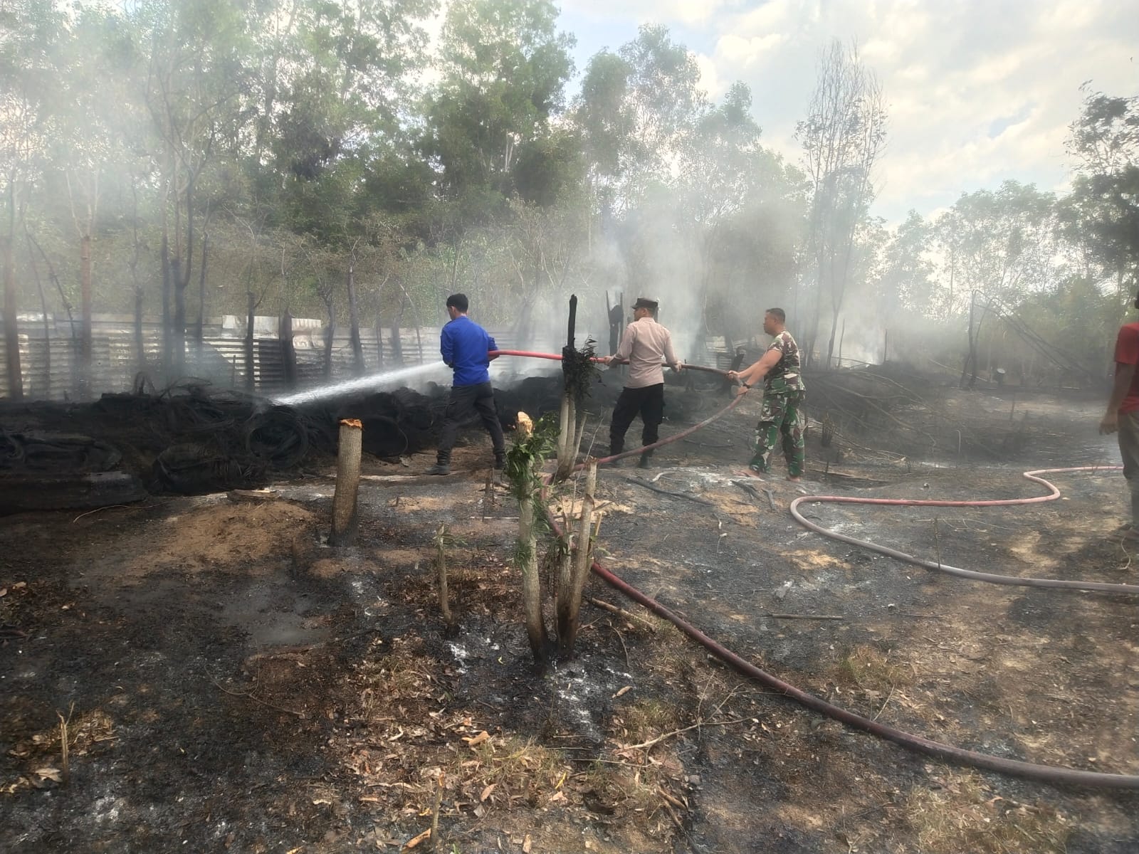 “Cuaca yang terik dan panas sehingga api begitu cepat menjalar dan membakar tumpukan ban bekas yang berada di pinggir pagar lahan tersebut. Serta membuat api berkobar dan kumpulan asap hitam melambung tinggi,” ujar Ridwan Jamil.