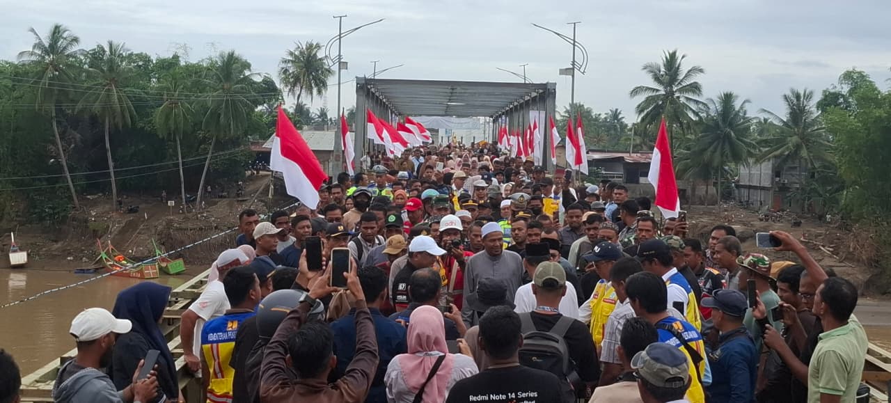 BIREUEN (Waspada.id): Jembatan Bailey penghubung Jembatan Krueng Tingkeum di Jalan Lintas Sumatera (Jalinsum) Kecamatan Kuta Blang, Bireuen, telah dibuka untuk kendaraan roda dua dan roda empat pada Sabtu (27/12) pukul 10.30 WIB. Jembatan aslinya putus akibat banjir beberapa waktu lalu.