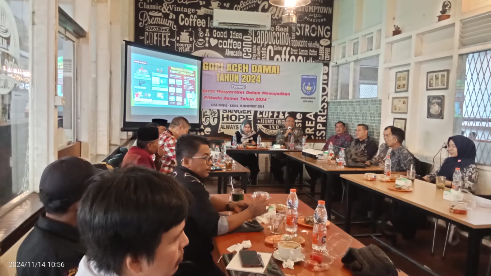 LANGSA (Waspada): Badan Kesatuan Bangsa dan Politik (Kesbangpol) Kota Langsa menggelar Ngopi Aceh Damai bertajuk ‘Peran Serta Masyarakat Dalam Mewujudkan Pilkada Damai Tahun 2024,’ di Hope Kopi Jalan A Yani Gampong Jawa Kecamatan Langsa Kota, Kamis (14/11).